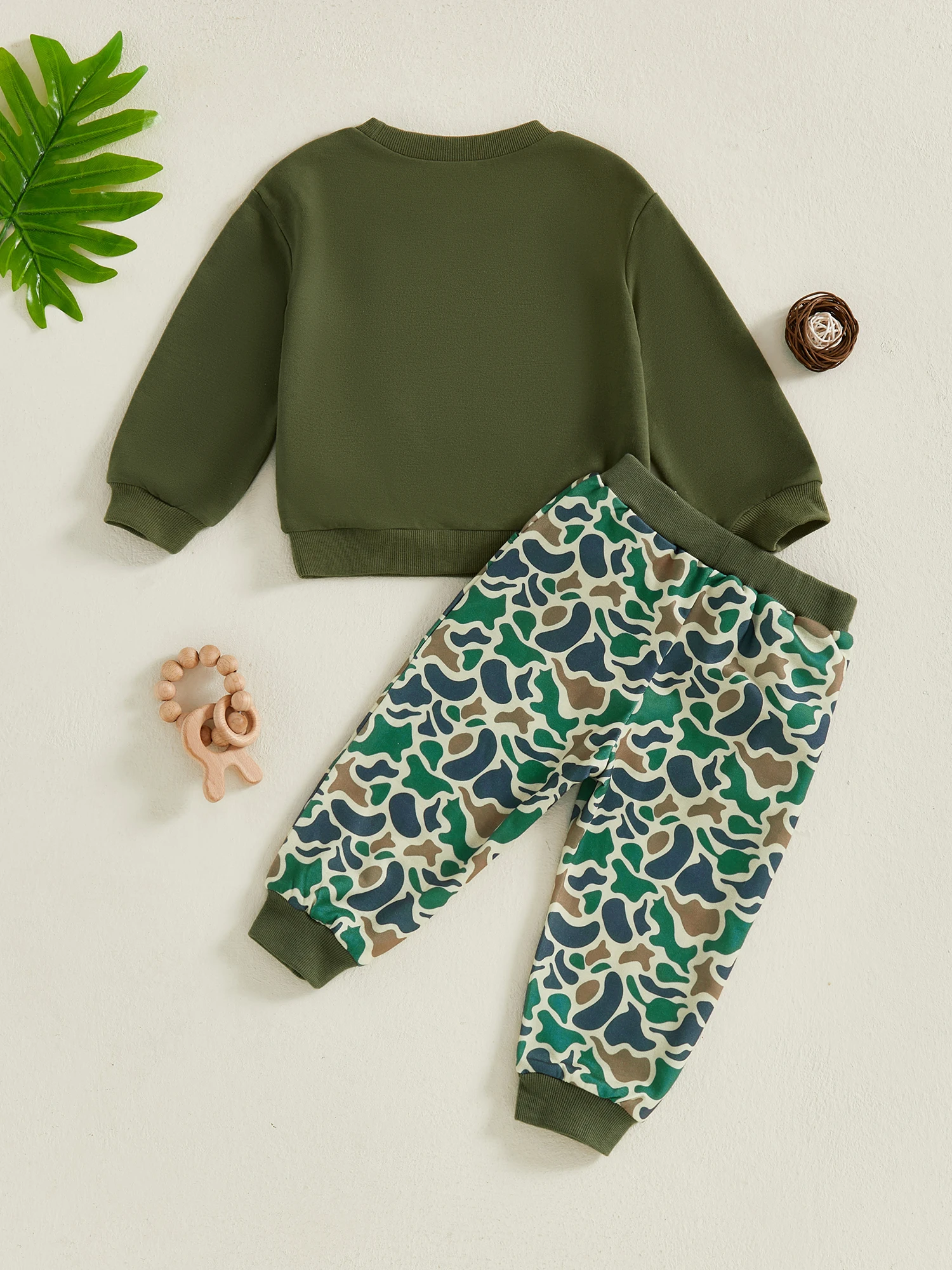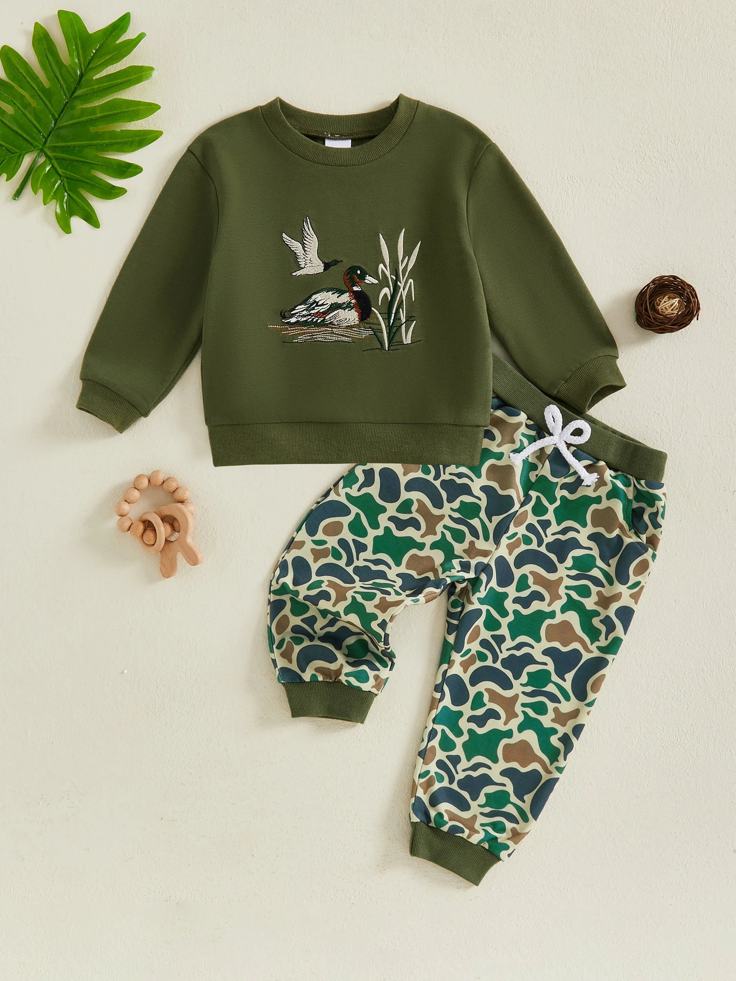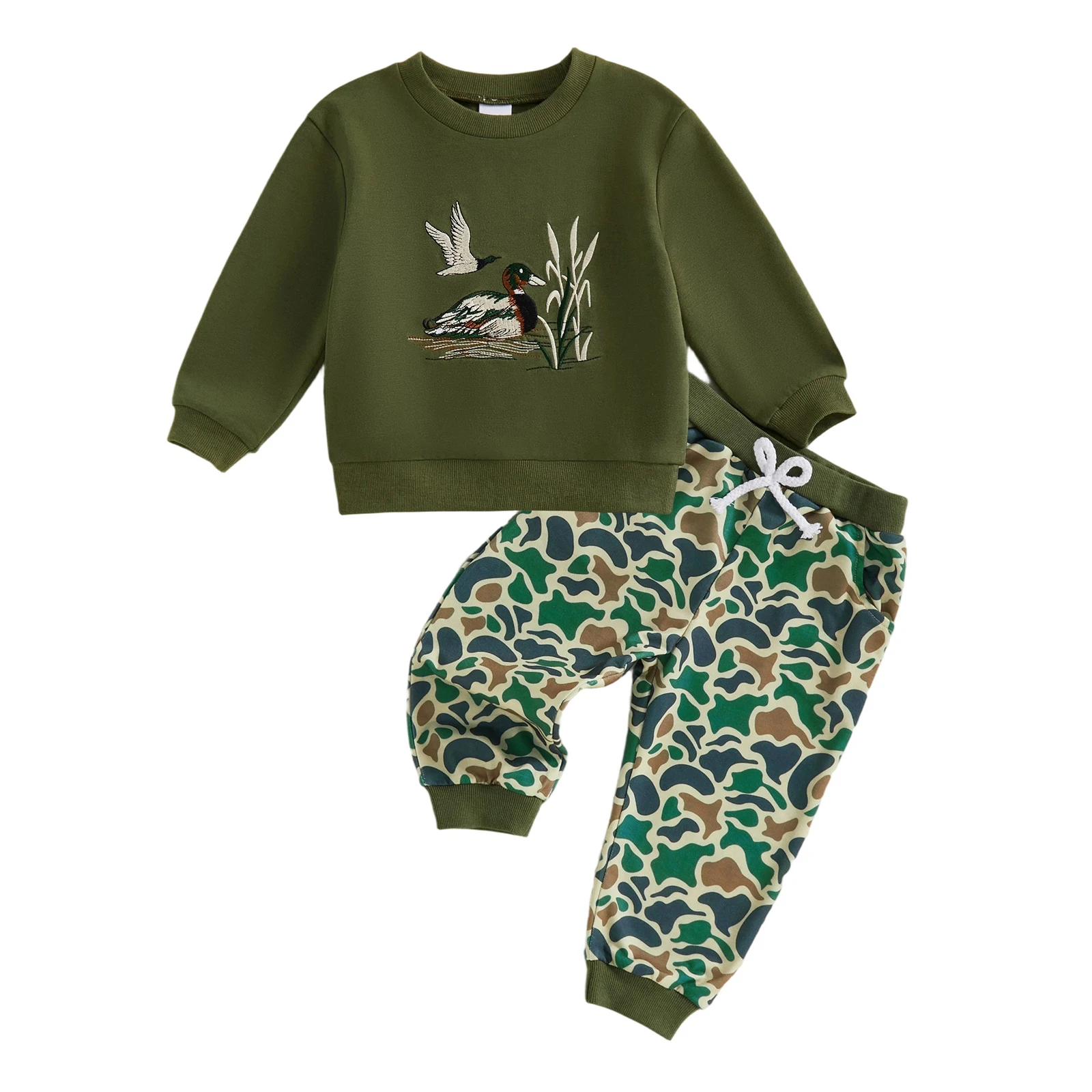 Cute Toddler Boy Autumn Clothes Set with Adorable Duck Embroidery Design on Long Sleeve Pullover and Matching Print Pants