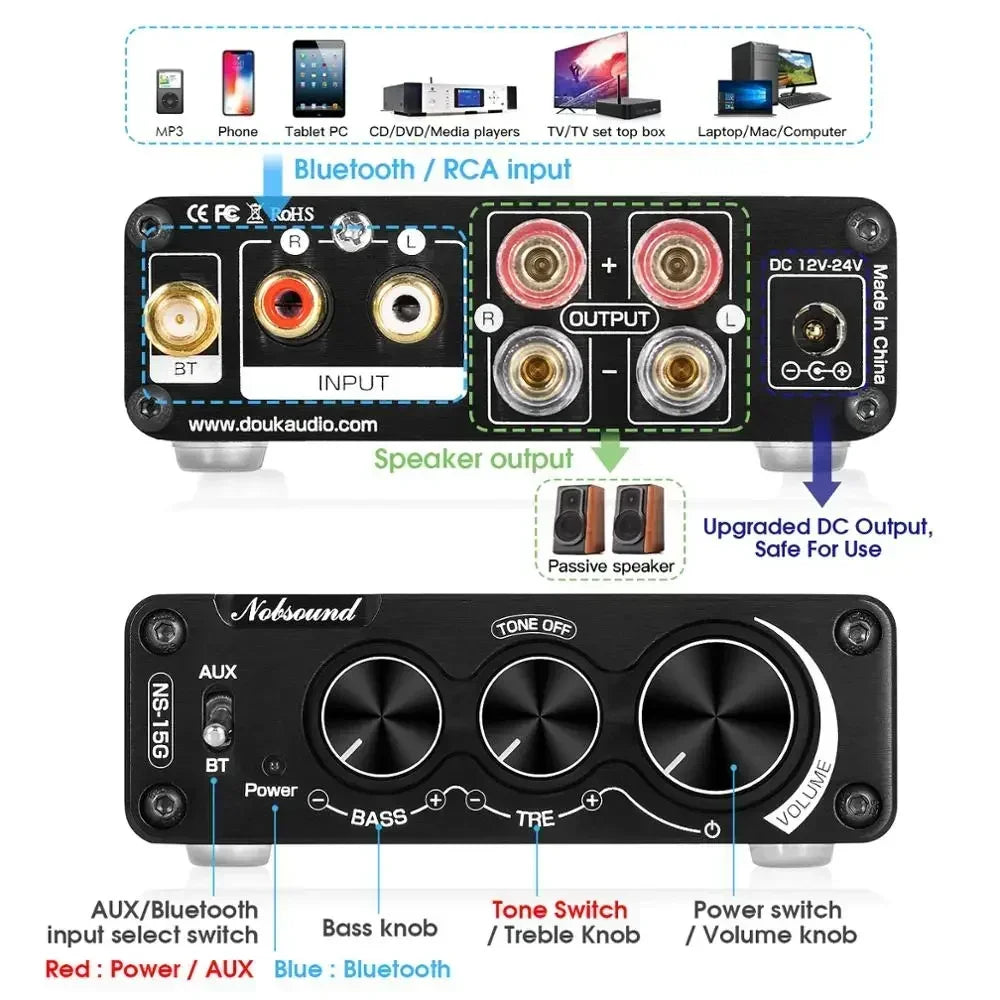 Strong compatibility and large output power: besides RCA, with Bluetooth 5.0 input supports up to 50ft connection range, stable and low delay. 2PCS TPA3116 chip, max output power can reach 200W, comes with 19V power supply, can drive 200W (8Ω) or 300W(4Ω) speakers.