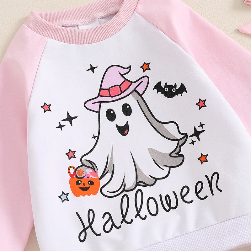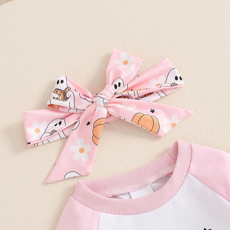 Kid Girls Pants Set, Ghost Print Sweatshirt with Flare Pants and Headband Halloween Clothes